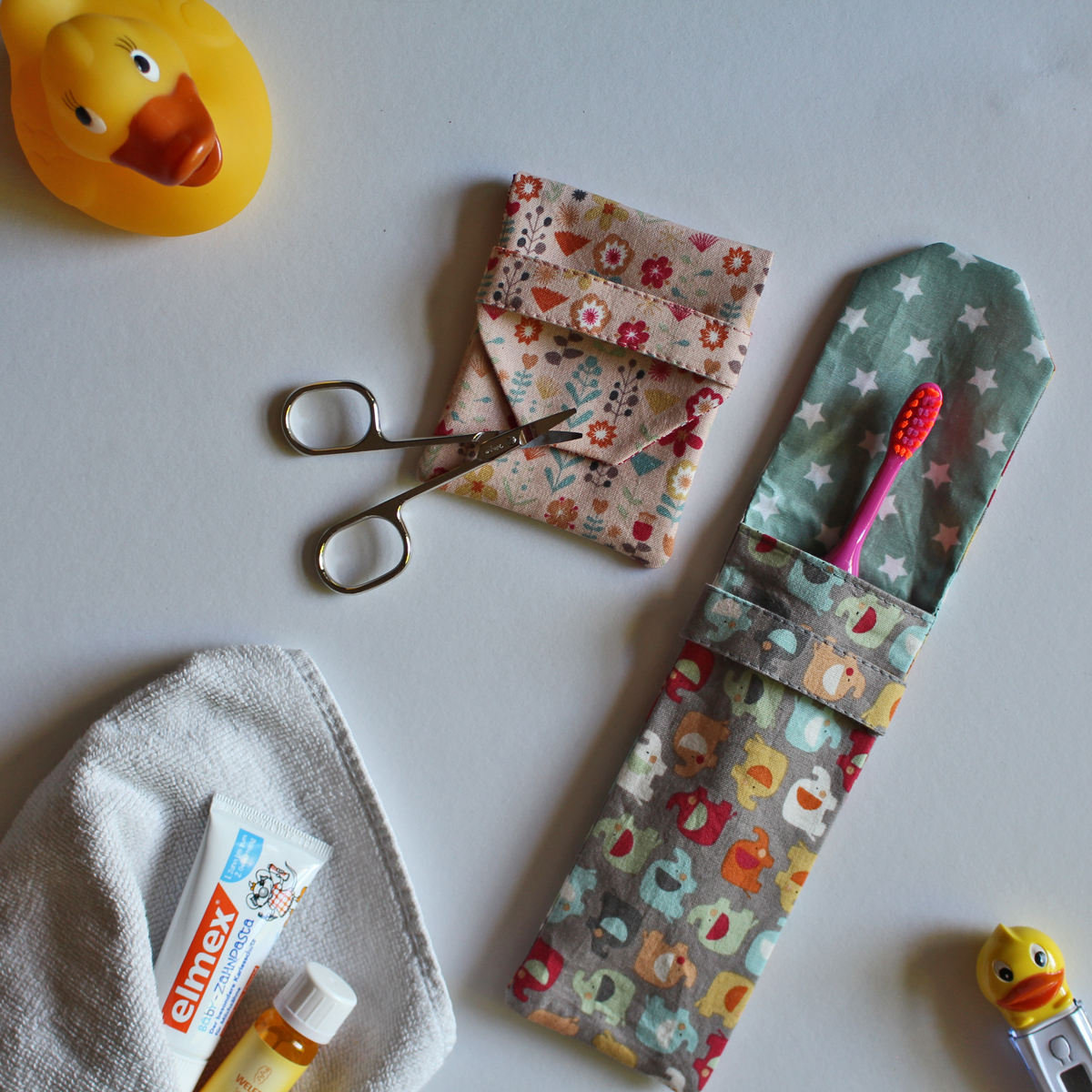 Genäht habe ich das kleine Laschentäschchen innen und außen aus Baumwolle. Beim Etui aka der Zahnputzhülle habe ich innen auf Wachstuch zurückgegriffen.